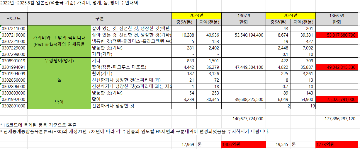 [조국일보/강성] 일본 활어 수입 /폐기 /방사능검사 2023년 2024년 일본산 활어패류 수입내역 (한화) <자료제공>관세청 …